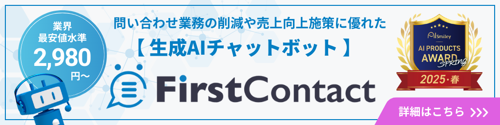 AIチャットボット「First Contact」は、高いコストパフォーマンスが魅力のAIチャットボットです。自社の目的や用途に合わせた最適なAIチャットボットの導入・運用をサポートできます。資料請求や20日間無料トライアルを利用可能ですので、この機会に下記よりお問い合わせください。