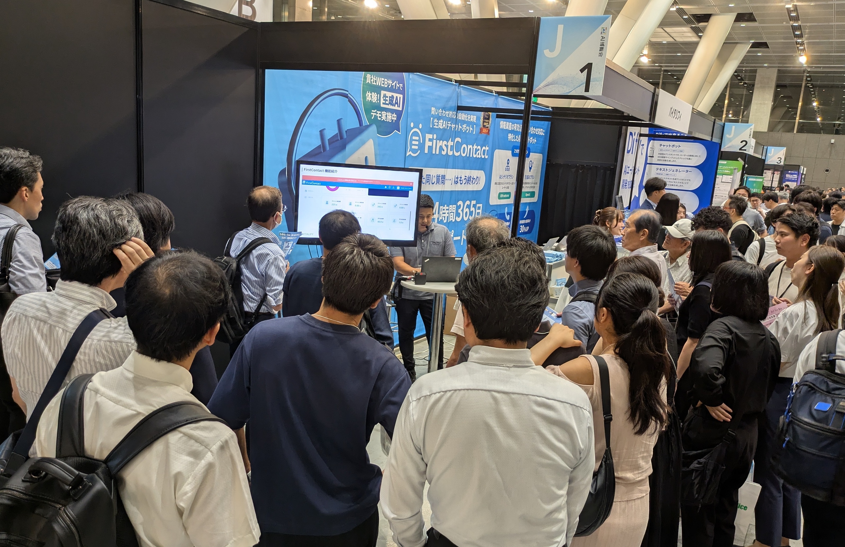今回、展示会での初の試みとして、展示ブースにてミニセミナーを開催いたしました。Dify、実演デモ、AI導入、FirstContactなど、様々なテーマについて、10~20分ほどの簡単な講習をブース内で行いました。予想を上回る多くの方に足を止めていただき、ミニセミナー後に登壇者に個別でご相談していただく方も多くいらっしゃいました。