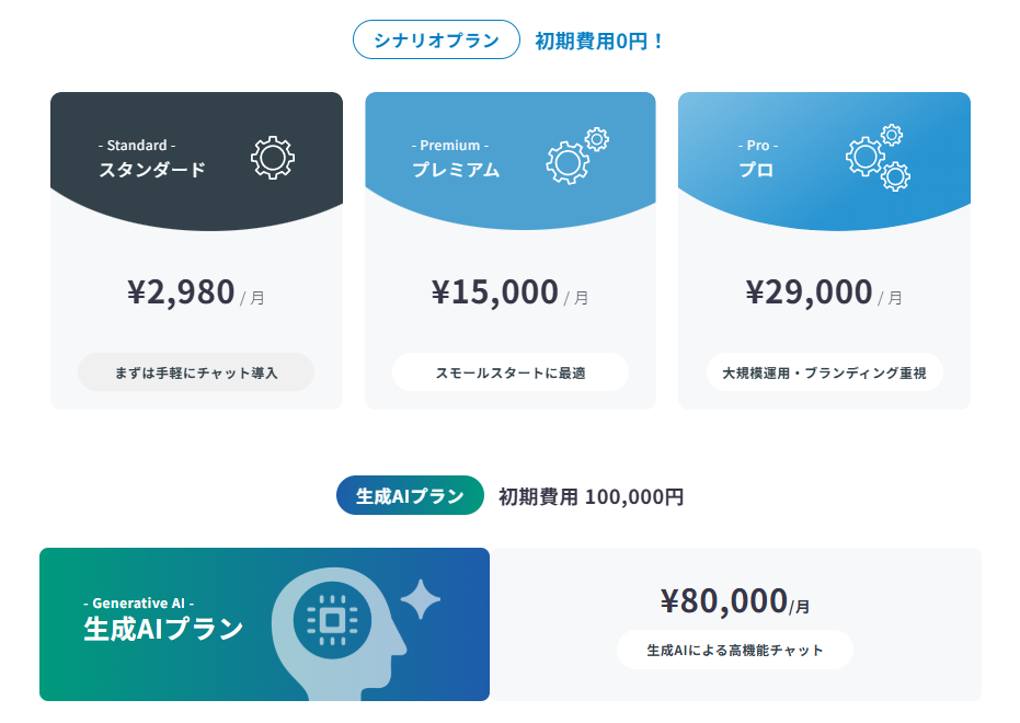 | 月額費用 | 有人対応プラン:2,980円 AI自動応答プラン:15,000円~ |