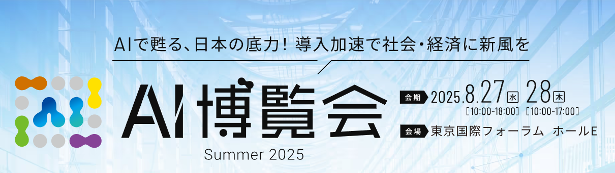2025年8月27日(水)、28日(木)の2日間、東京国際フォーラムで開催される「AI博覧会 Summer 2025」に出展いたします。